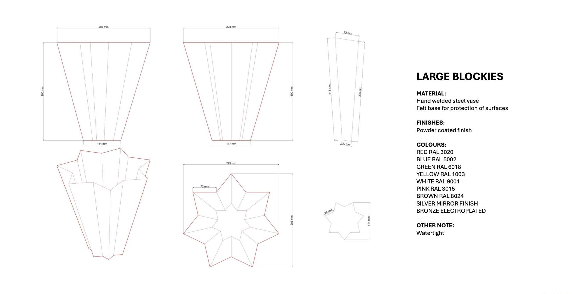 A bold, oversized vase with a wide opening and star-shaped profile — perfect as a statement floor piece. Hand-welded steel, powder-coated, felt-based, and fully watertight.