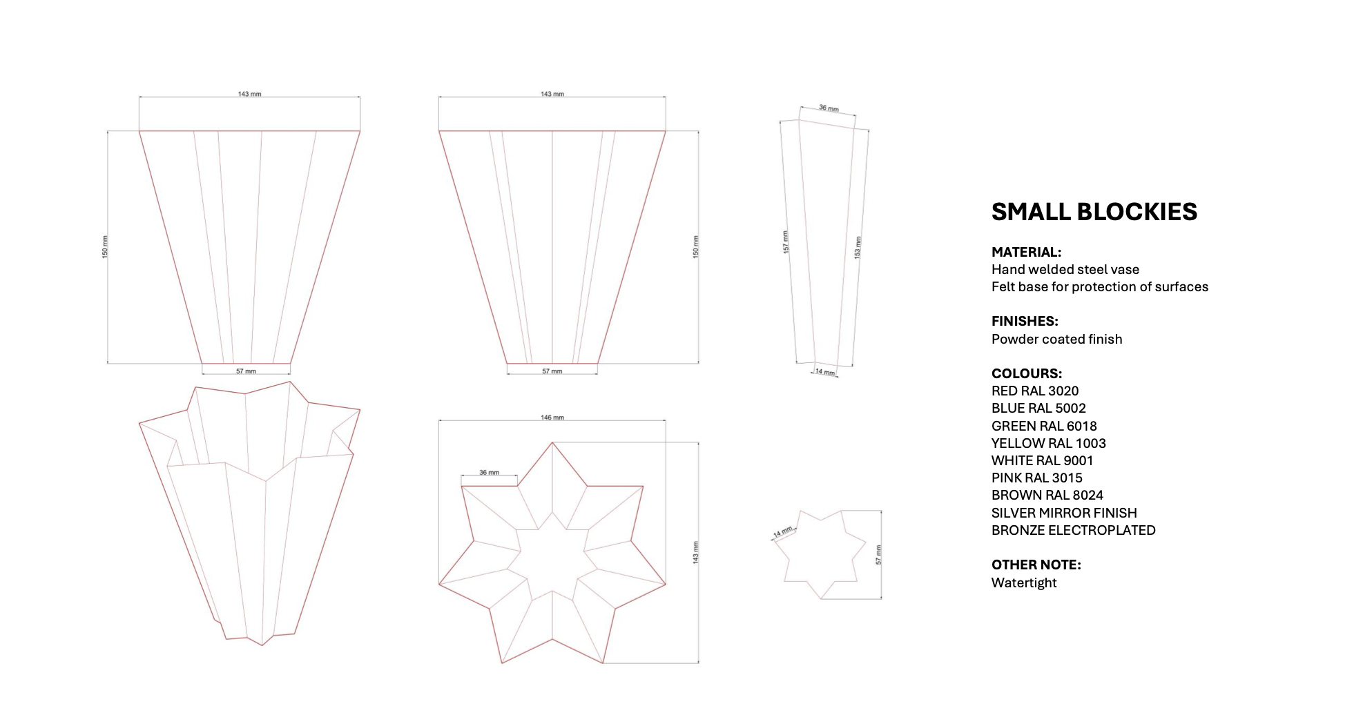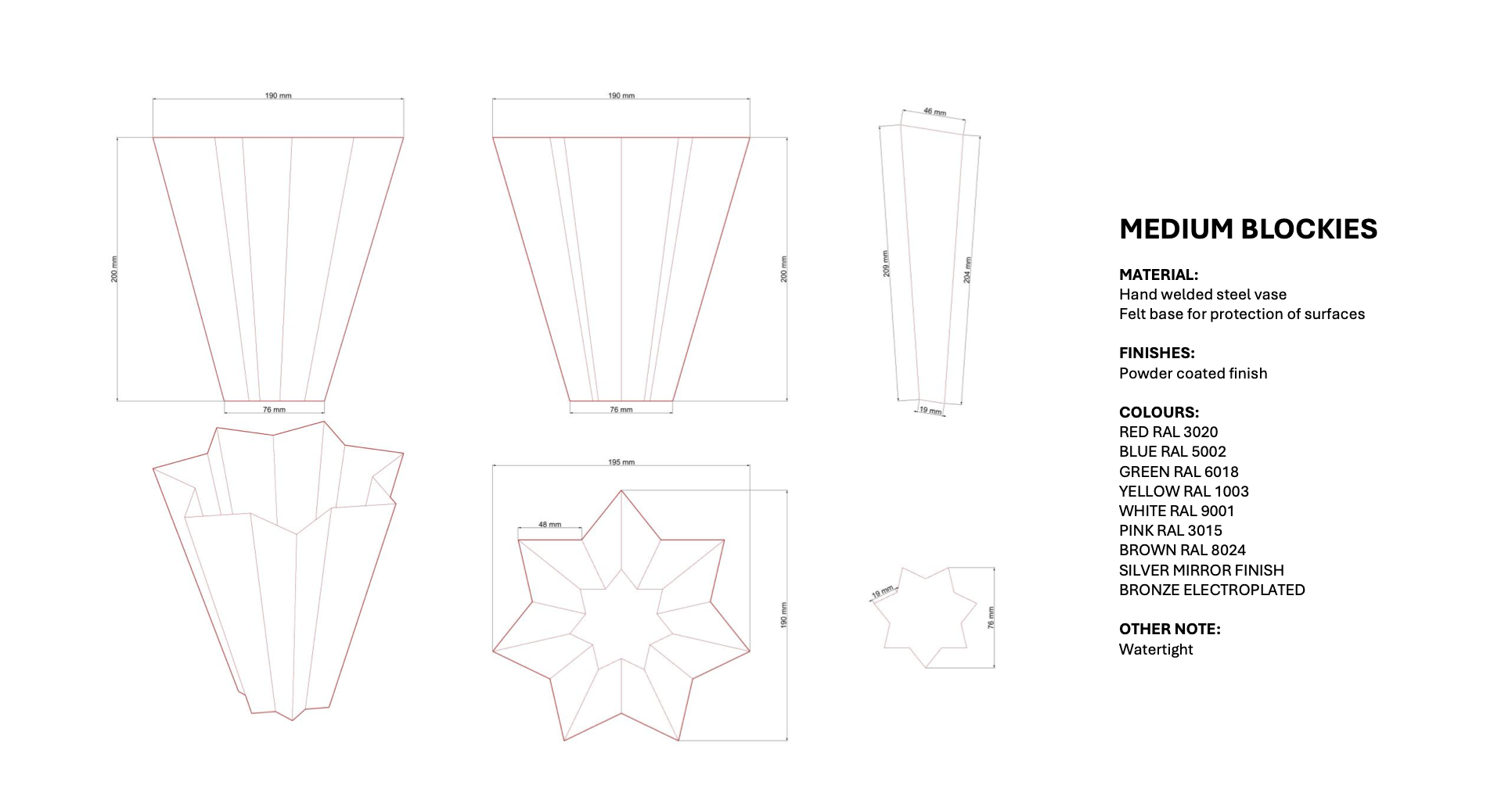 A compact, lightweight Blockies vase — ideal for desks and shelves. Powder-coated steel, felt-based, and fully watertight.